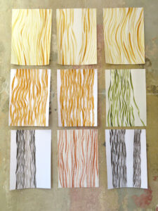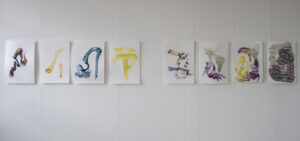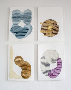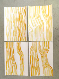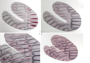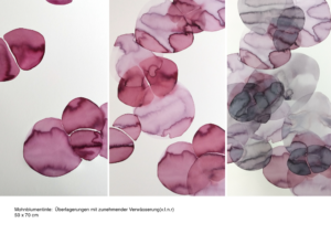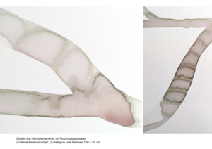 Ich arbeite mit Tinten, die ich selbst aus Naturmaterialien herstelle. Diese Tinten haben besondere, individuelle Eigenschaften. Sie unterscheiden sich nicht nur in der Farbe, auch in Konsistenz, Trocknungsverhalten, Glanz oder Verlaufseigenschaften. Manche verändern ihre Farbe im Prozess, reagieren miteinander oder/und mit dem Papieruntergrund. Meine Arbeitsweise verstehe ich als zeichnerisches Experimentierfeld, in dem ich nach Formen suchte, die den natürlichen Tinten eine Gestalt geben um ihre Eigenwilligkeit aufzuzeigen.